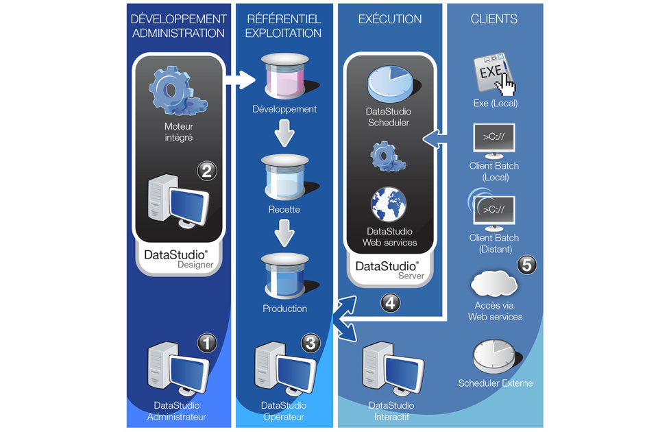 DataStudio est une solution ETL destinée aux architectures multi-plateformes. Facile d’accès, elle s’appuie sur des instructions en SQL, le langage de requêtage de référence des informaticiens. De l’identification à la diffusion, DataStudio aide à manipuler toutes les données de l’entreprise « On-Premise » (sur site) ou dans le « Cloud » (hébergement distant), dans tous les formats : du simple fichier Ascii aux données des environnements Big Data.